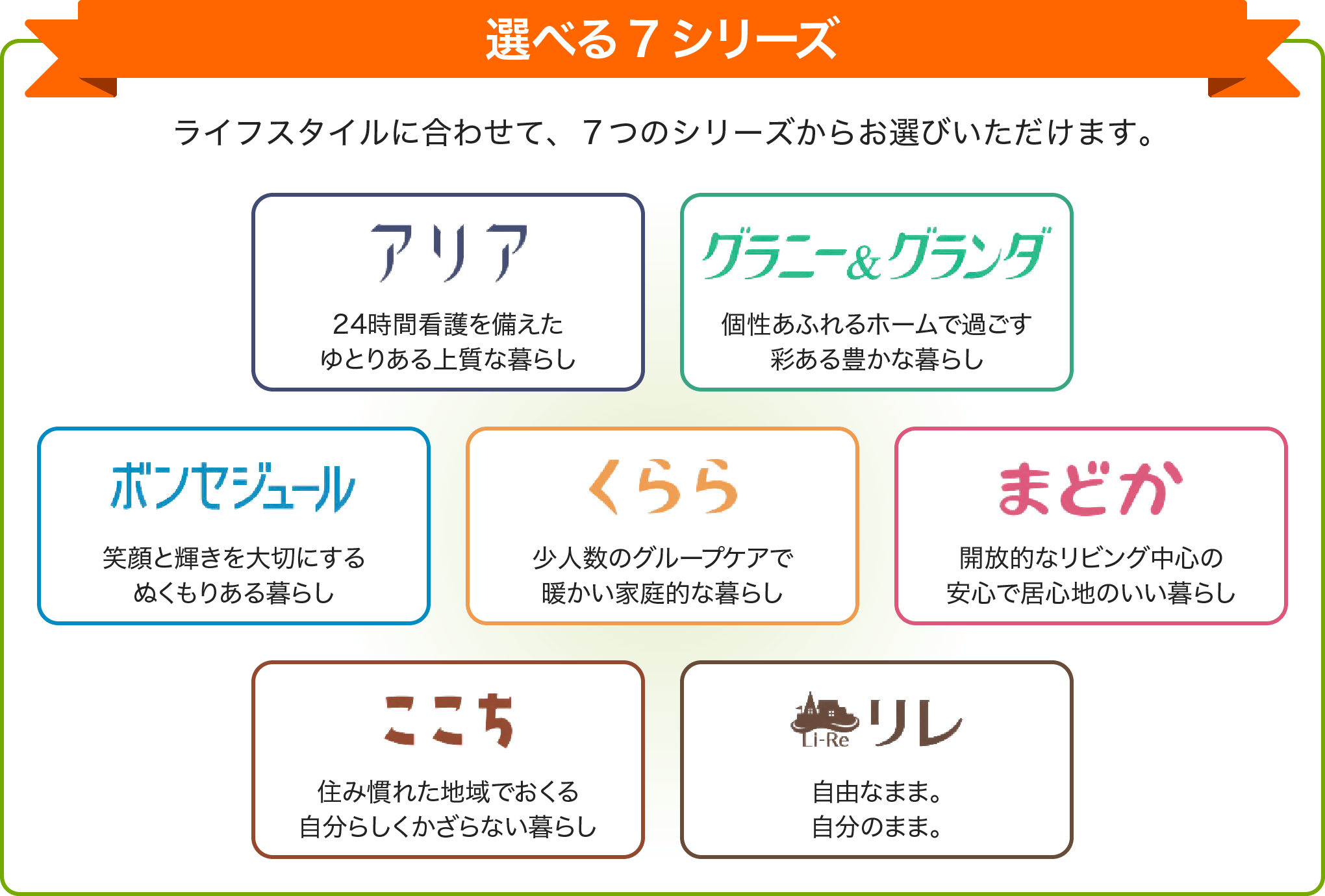 ベネッセスタイルケアが運営するホームは、全国に300ヶ所以上(※) 以下の7つのシリーズがございます。